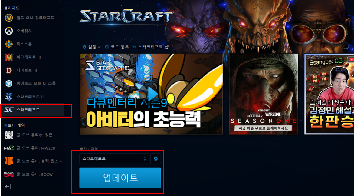 12. 로그인을 하면 아래와 같은 창이 뜨고 중간쯤에 있는 스타크래프트를 선택합니다. 그 후 아래에 설치 버튼을 클릭합니다.(저의 경우에는 이미 설치가 되어있어 업데이트 버튼으로 나타난 것이니 처음 설치하시는 분들은 '설치'라고 나타납니다.)